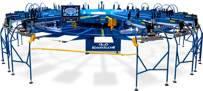 - It is a high-production oval screen printing press available. M&R’s Gauntlet® 4 is a modular system with 16/14, 18/16, or 20/18 station/color configurations, expandable for larger setups. In other words, it handles up to 20 stations and 18 colors for multi-color jobs.