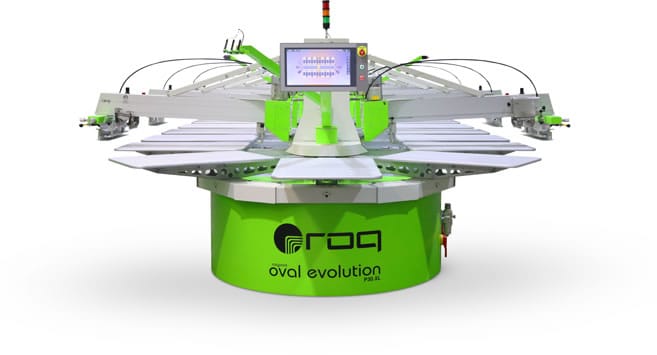 - The ROQ Oval Evolution is a high-production automatic press capable of printing up to 950 garments per hour.